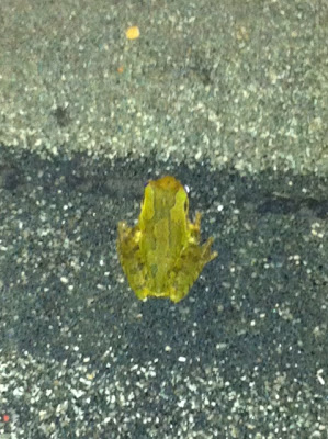 About a week ago, I was walking down my path to the road one evening after dark, when I felt the distinct feeling of something slimy wrap one arm/leg around my ankle, and then another as I began shaking my leg vigorously in the air while balancing on the other. I saw the little bugger fly and land on the walk, but as I took a few steps back and rummaged for my cell phone to shine a light and see what it was, it disappeared. Eeeeewww! When I arrived to meet my friend Krystal, my heart was still pounding, and I was checking my ankle in the low light, to see if there were any skin reactions slime left on my leg. The men laughed, telling me it was a wet leaf that probably flipped up from my shoe or something. But I could not forget the distinct feeling of the slimy body applying itself to my skin, one leg at a time. The next night, on my walk home, this little guy lept into the lit area of the path, so I took his picture to prove to those guys I know what I felt! Bleh!